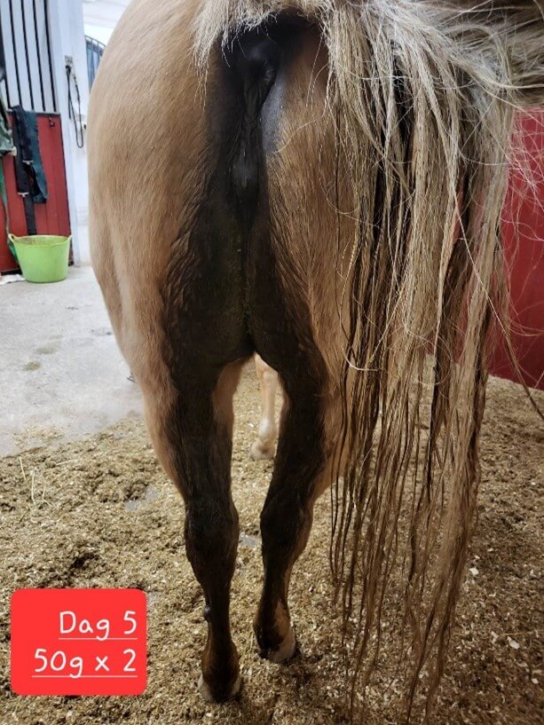 Det er også noen tilbakeslag på 2-3 dager innimellom, hvor gjødningvannet kommer i litt større mengde, slik at underbeina blir litt våte – men slett ikke som før. Gjødselvann forekommer fortsatt noen ganger, men nå i så liten mengde at det kun havner i halen og ikke renner langs beina.