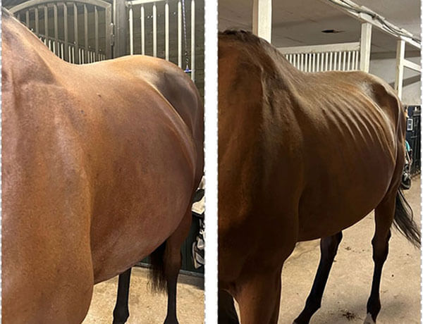 Han har tatt på seg pent og begynner nå å legge på seg muskler. Vi har vært nøye med treningen og startet ham opp fra bunnen av. Målet har vært å øke vekten og styrke immunforsvaret ved hjelp av MicroVital og kraftfôret.