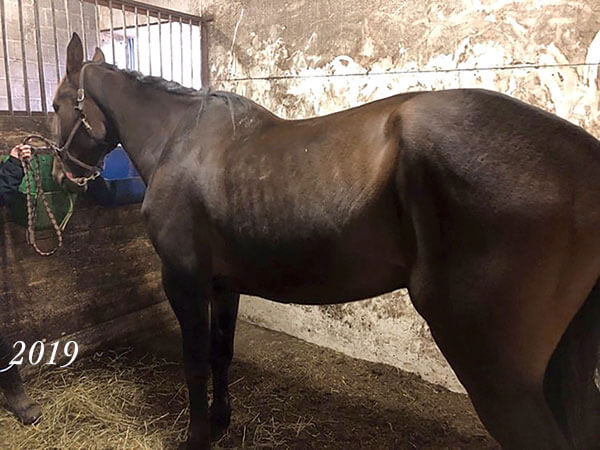 Bönä er en 5 år gammel standardtraver, som vi møtte tidlig på høsten 2019. På det tidspunkt spiste Bönä havre og standardfôr. Den var tynn, muskelløs og led av mageproblemer, men klarte seg fortsatt bra i travløp. Det første bildet er fra denne tiden.