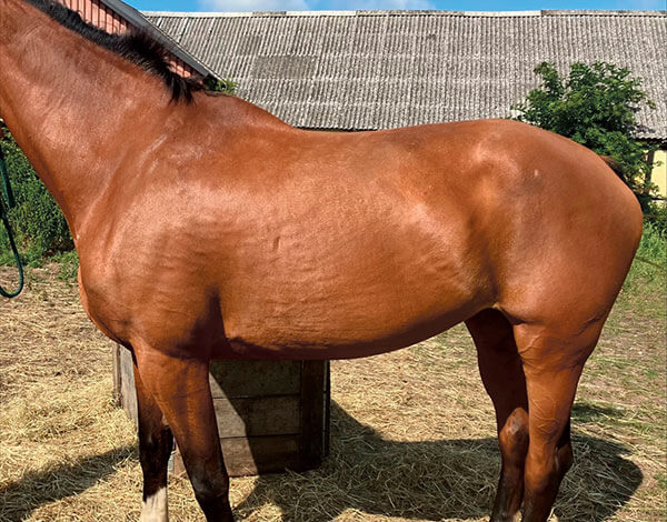 Hun har vært på dette fôret i omtrent 7 måneder. Pelsen hennes ser fantastisk ut – og hun har god huld for den saks skyld. Hun er ikke lenger i ferd med å gå ut av sitt gode skinn. Nå kan man strigle henne uten at hun er i ferd med å velte, fordi det klør ikke lenger så forferdelig mye. Hun har blitt en gladere hest å være sammen med. Man trenger ikke lenger være redd for å bli bitt eller sparket når man er i nærheten av henne.