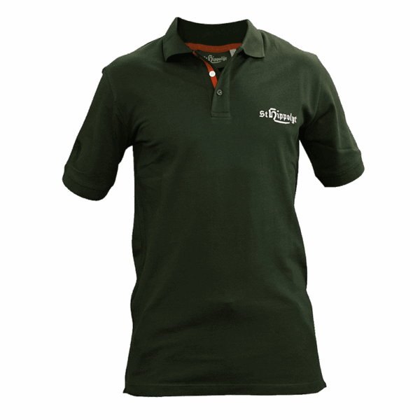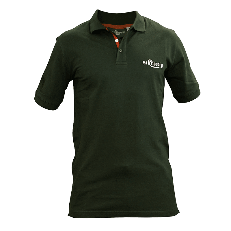 St. Hippolyt Polo-shirt – Herremodell i grønt med broderi på bryst, ermer og rygg. Denne polo-shirt er et absolutt blikkfang i enhver stall.